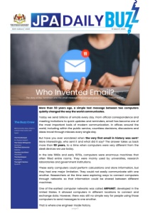 page 1 30th Edition/ 2026 13 March 2026 Behind every story, there is a team that works with heart. The Pulsekeeper Dr. Diyana Hassim The VisionWhisperer Norazizul The Pixel Alchemist Sabrina The Buzz Architect Lidyawati The Buzzkeeper Nurfazlina The Light Catcher Syukran The Buzz Crew More than 50 years ago, a simple test message between two computers quietly changed the way the world communicates. Today we send billions of emails every day. From official correspondence and meeting invitations to quick updates and reminders, email has become one of the most important tools of modern communication. In offices around the world, including within the public service, countless decisions, discussions and ideas travel through inboxes every single day. But have you ever wondered when the very first email in history was sent ? More interestingly, who sent it and what did it say? The answer takes us back more than 50 years, to a time when computers were very different from the sleek devices we use today. In the late 1960s and early 1970s, computers were enormous machines that often filled entire rooms. They were mainly used by universities, research laboratories and government institutions. These early computers could perform calculations and store information, but they had one major limitation. They could not easily communicate with one another. Researchers at the time were exploring ways to connect computers through networks so that information could be shared between different machines. One of the earliest computer networks was called ARPANET , developed in the United States. It allowed computers in different locations to connect and exchange data. However, there was still no simple way for people using those computers to send messages to one another. That is where one engineer made history. Who Invented Email? The story of Ray Tomlinson and the small message that changed global communication forever.
