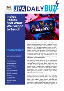 page 1 Inside Roblox andWhat We Forgot to Teach When I first read the news about a teenager who harmed his sibling after an incident in Roblox, I couldn’t shake the feeling that this was more than a tragic, isolated act but it felt like a symptom. Out of curiosity, I registered and played Roblox for nearly 24 hours. Yes, 24 hours of building, trading, fighting that immersed in the rhythm which millions of children live in daily. At first glance, it seemed imaginative and harmless. But after hours inside that world, I felt something else, a quiet emptiness. A world rewarding constant motion but offering little guidance in meaning. Then I began to wonder. In schools, do our children know why they go there every morning? Does anyone remind them that learning isn’t just about exams and that education is about discovering who they want to become? When a student loses that sense of direction, learning becomes a routine, not a purpose, and the same applies to us, the adults. Are we creating a sense of belonging and purpose in our offices, or just meeting targets and completing forms? And then there’s home, the first classroom that shapes everything. How many parents, after a long day, scroll through their phones from 8 p.m. to midnight while asking, “Dah makan? How’s school?” Are those real conversations, or background noise between notifications? When children see that, they imitate us. They, too, turn to their screens, scrolling or gaming for 16th Edition/ 2025 7 November 2025 Behind every story, there is a team that works with heart. The Pulsekeeper Dr. Diyana Hassim The WordWeaver Nadiah Begum The VisionWhisperer Norazizul The Pixel Alchemist Sabrina The Buzz Architect Lidyawati The Buzzkeeper Nurfazlina The Light Catcher Syukran The Buzz Crew