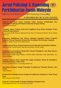 31 DISEMBER 2024 Bil. 18 ISSN: 2229-810X Pengaruh Kecerdasan Emosi Terhadap Tahap Tekanan, Kebimbangan Dan Kemurungan Kakitangan Di Pejabat Setiausaha Kerajaan Pahang Noor Shamsiah Hussin Hubungan Antara Tekanan Kerja Dan Penglibatan Kerja Dalam Kalangan Warga Jabatan Perdana Menteri Hanani Izyan Mohd Ramzam, Mohamad Fauzi Saad, Nor Kamaliati Khamis, Nurul Athikah Abdul Aziz Pengesahan Multidimensi Dan Ukuran Sokongan Organisasi Dalam Perspektif Kompleks Pekerja-Organisasi Kementerian Perumahan Dan Kerajaan Tempatan Maemuna Abidin, Nurrul Azwa Mohd Kassim Tahap Kepuasan Kerja Warga Kementerian Pertanian Dan Keterjaminan Makanan Haslina Hasan, Zuraini Ismail, Rina Hazwani Bohari, Nordin Yusoff Pengaruh Literasi Kesihatan Mental Dan Tekanan Psikologi Ke Atas Sikap Mencari Bantuan Profesional Psikologi Megat Syaiful Izuddin Megat Mokhtar, Faridah Abdul Jalil@Abas, Intan Sofia Rafiee, Nur Haniza Zainudin Penilaian Keadaan Emosi Negatif Dan Stigma Kesihatan Mental Di Pentadbiran Setiausaha Kerajaan Negeri Perak Siti Nur Syuhada Mansor, Nur Syafiqa Mohd Arif Kaunseling Kelompok Sebagai Pemangkin Kesejahteraan Psikologi Manusia: Satu Ulasan Amran Hassan Kesahan Dan Kebolehpercayaan Saringan Kesejahteraan Psikologi 3A Untuk Warga Emas Wan Nurayunee Wan Zulkifli Pengaruh Trait Personaliti Terhadap Kejelekitan Kelompok Kerja Nurul Hudani Md Nawi, Nur Farah Syazwani Said